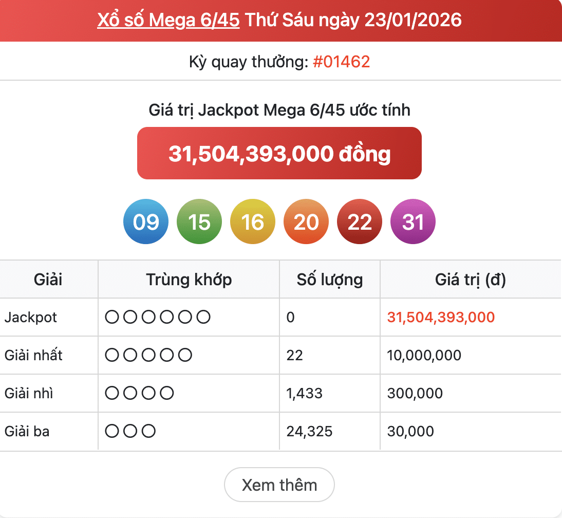 Mega 6/45 và Power 6/55 với giá trị Jackpot được cập nhật liên tục.